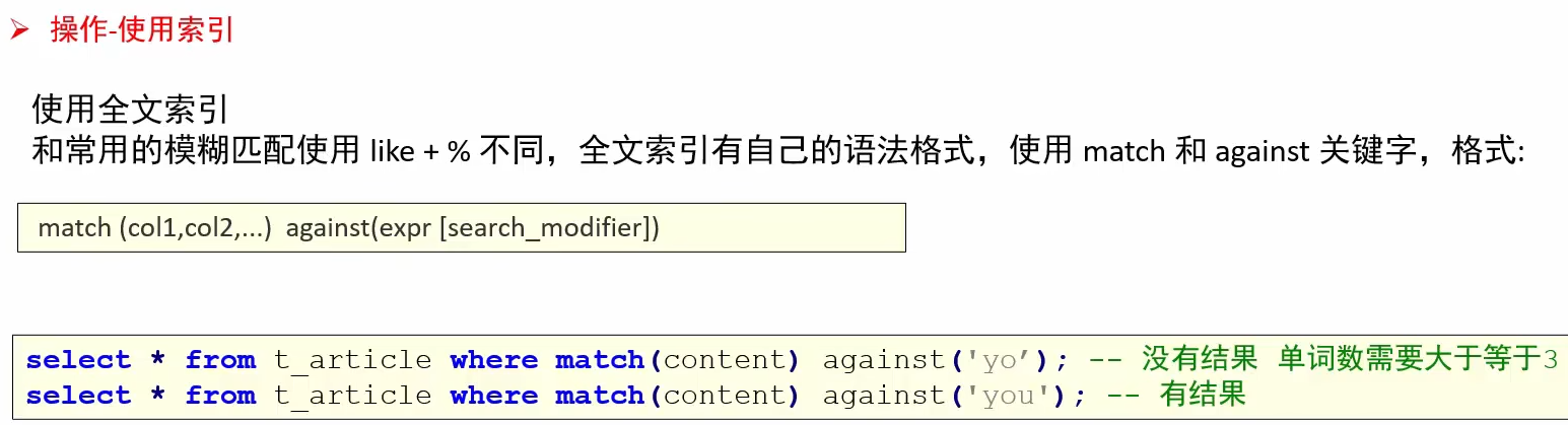 - 用like+%就可以实现模糊匹配了,为什么还要全文索引?like+%在文本比较少时是合适的,但是对于大量的文本数据检索,是不可想象的。全文索引在大量的数据面前,能比like+%快N倍,速度不是一个数量级,但是全文索引可能存在精度问题。