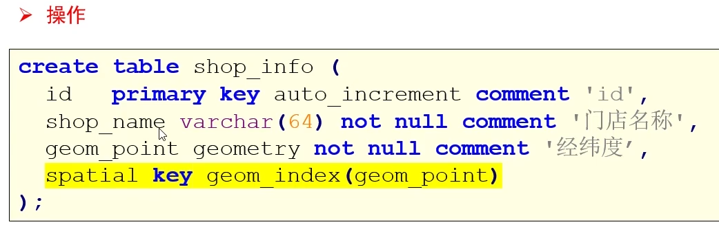 - 创建空间索引的列,必须将其声明为NOT NULL。