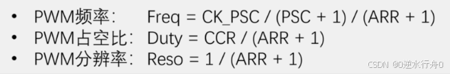 - PWM频率 :f_pwm = f_apb / [(PSC + 1) × (ARR + 1)]