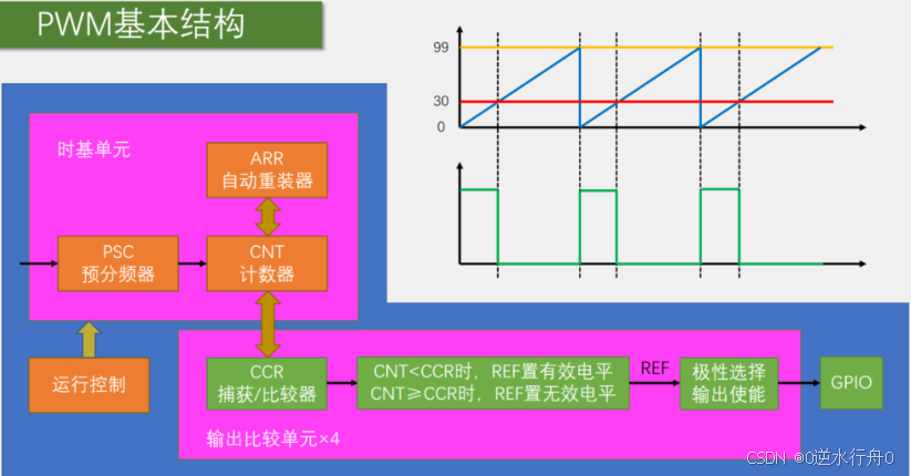 所有支持PWM输出的定时器均基于同一硬件结构:16位自动重装载计数器(ARR)、16位捕获/比较寄存器(CCR)、预分频器(PSC)及输出比较单元。其工作流程如下: