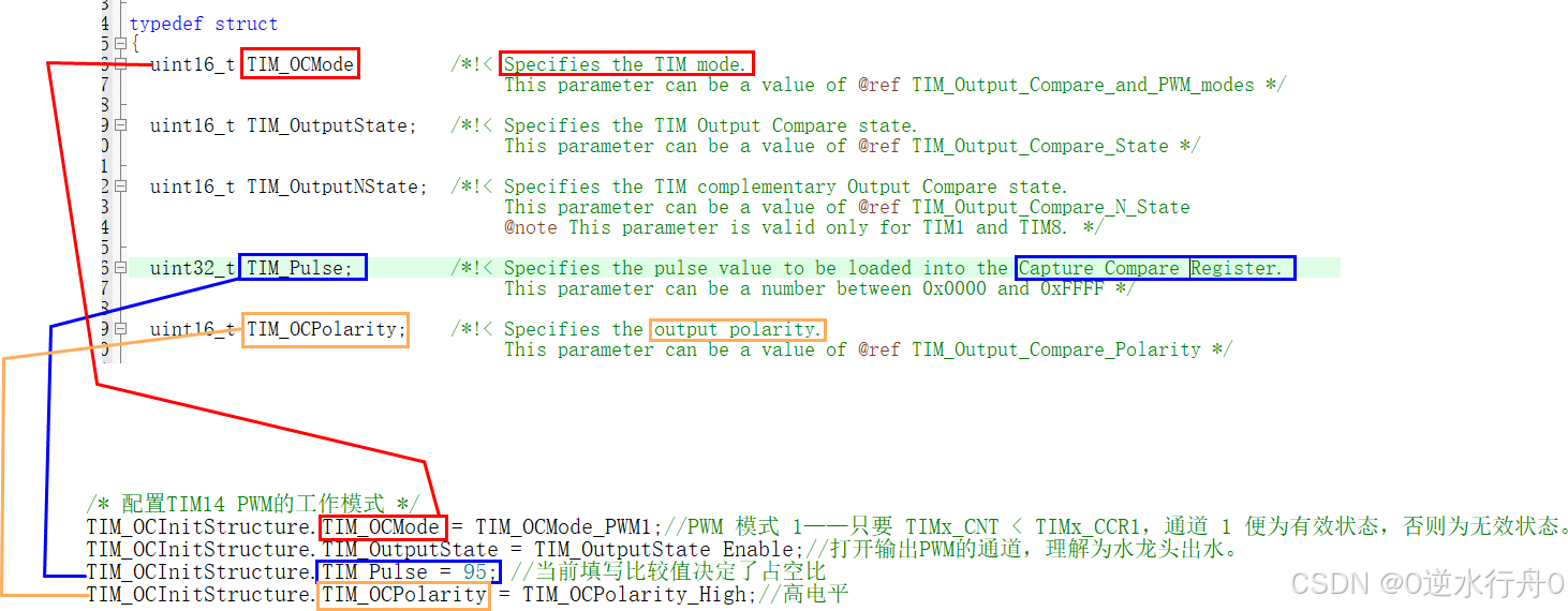 TIMx_CNT 由TIM_TimeBaseStructure.TIM_Period决定;TIMx_CCR1由TIM_SetComparex(x:1、2、3、4)函数决定;有效状态由TIM_OCInitStructure.TIM_OCPolarity决定;