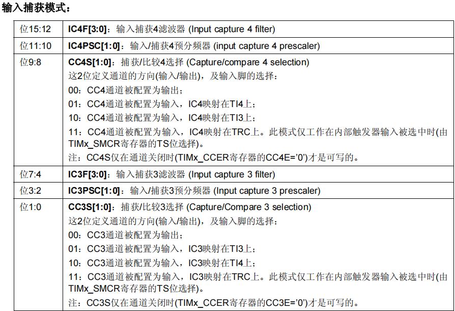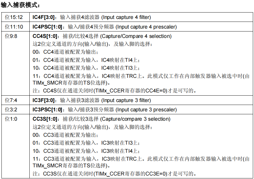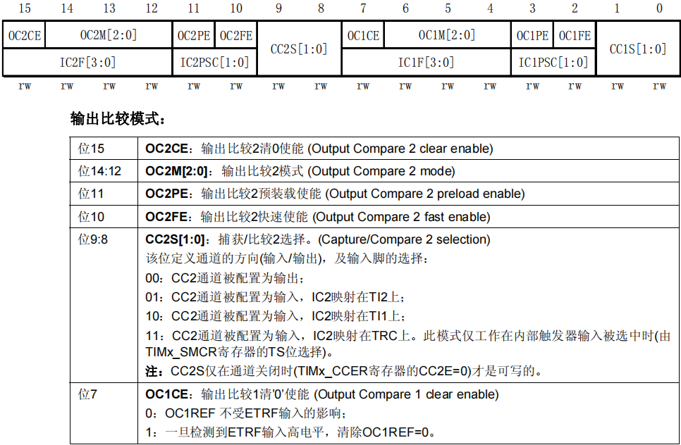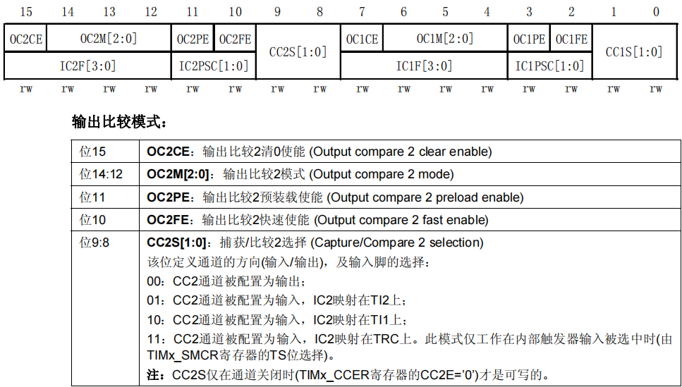 OCxx描述了通道在输出模式下的功能,ICxx描述了通道在输出模式下的功能。