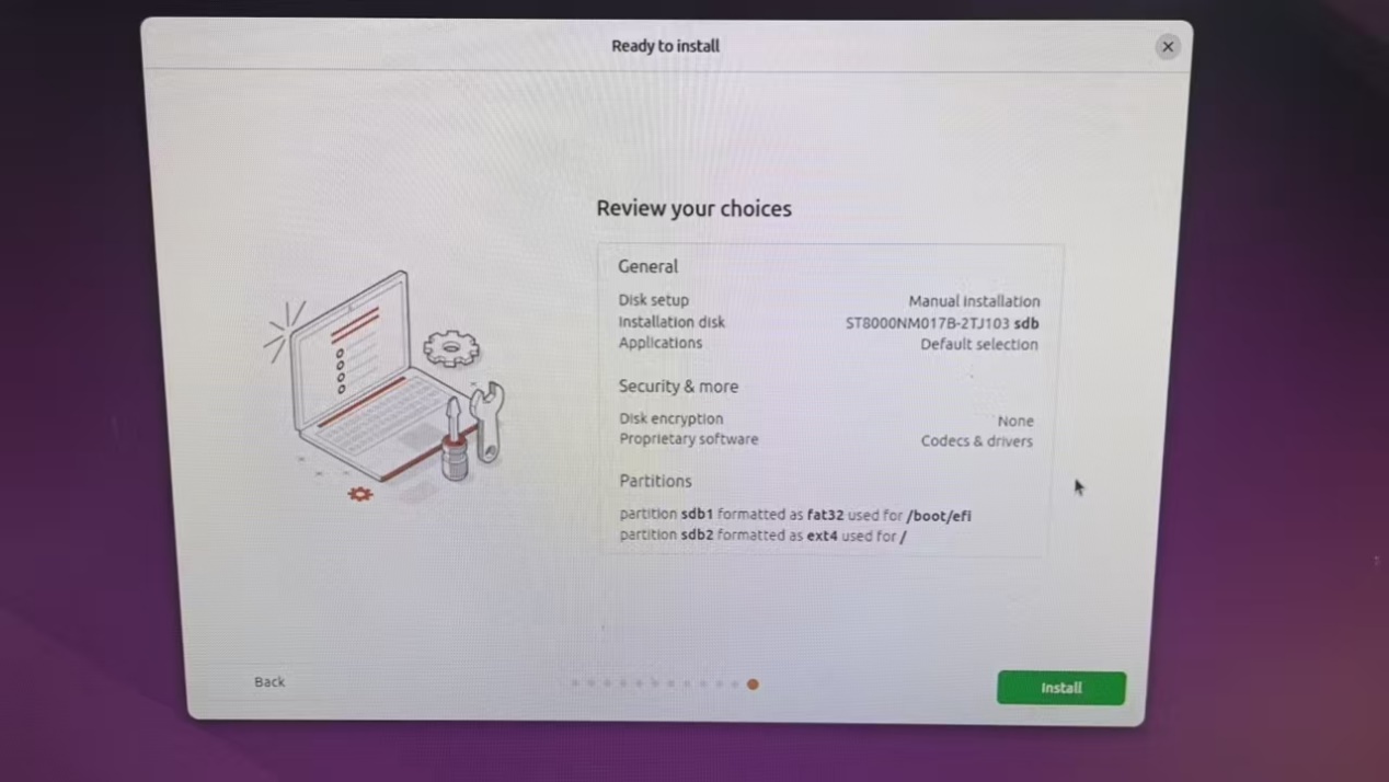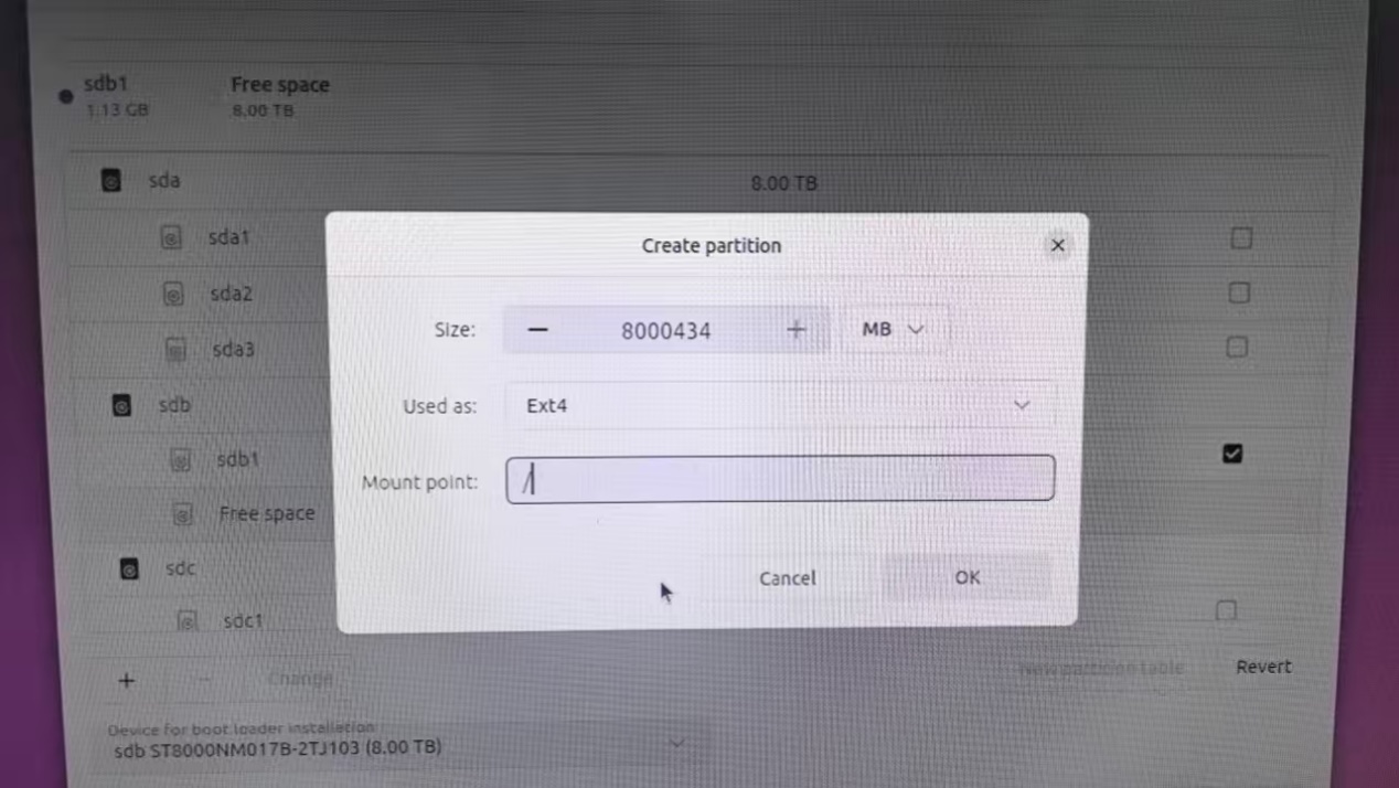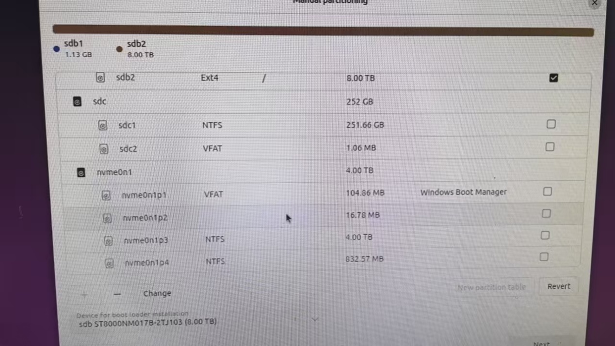 !!!!注意一定先在左下角选择ubuntu安装在8T的那个空闲的盘,系统会自动分出1G的/boot/efi空间,如果不选而是手动写,那next按钮会一直为灰色。