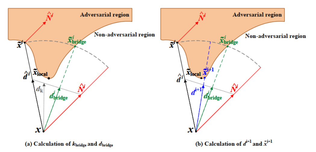 图 1. TtBA 中一次迭代的几何图示。在 (a) 中,在第 iii 次迭代时,xxx 代表原始图像,d^i\hat{d}^id^i 是当前扰动方向的单位向量,xˉi\bar{x}^ixˉi 是沿 d^i\hat{d}^id^i 的边界点,N^i\hat{N}^iN^i 是 xˉi\bar{x}^ixˉi 处的单位法向量,xˉlocal\bar{x}{\mathrm{local}}xˉlocal 表示局部最优对抗性示例。我们定义一个方向 dk=k⋅N^i+(1−k)⋅d^id_k = k \cdot \hat{N}^i + (1 - k) \cdot \hat{d}^idk=k⋅N^i+(1−k)⋅d^i,其中 k∈(0,1]k \in (0, 1]k∈(0,1] 是一个权重参数。使用二分搜索,我们可以识别出 k=kbridgeik = k{\mathrm{bridge}}^ik=kbridgei,使得方向 dbridgei=kbridgei⋅N^i+(1−kbridgei)⋅d^id_{\mathrm{bridge}}^i = k_{\mathrm{bridge}}^i \cdot \hat{N}^i + (1 - k_{\mathrm{bridge}}^i) \cdot \hat{d}^idbridgei=kbridgei⋅N^i+(1−kbridgei)⋅d^i 与 d^i\hat{d}^id^i 具有相同的决策边界,即 g(dbridgei)=g(d^i)g(d_{\mathrm{bridge}}^i) = g(\hat{d}^i)g(dbridgei)=g(d^i)。然后我们使用 k=2/3kbridgeik = 2 / 3 k_{\mathrm{bridge}}^ik=2/3kbridgei 直接生成下一个方向:di+1=2/3kbridgei⋅N^i+(1−2/3kbridgei)⋅d^id^{i + 1} = 2 / 3 k_{\mathrm{bridge}}^i \cdot \hat{N}^i + (1 - 2 / 3 k_{\mathrm{bridge}}^i) \cdot \hat{d}^idi+1=2/3kbridgei⋅N^i+(1−2/3kbridgei)⋅d^i,如 (b) 所示。边界点 xˉi+1=x+g(di+1)⋅d^i+1\bar{x}^{i + 1} = x + g(d^{i + 1}) \cdot \hat{d}^{i + 1}xˉi+1=x+g(di+1)⋅d^i+1 产生下一个对抗性示例。