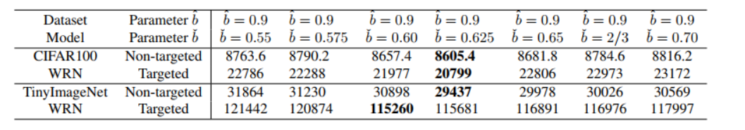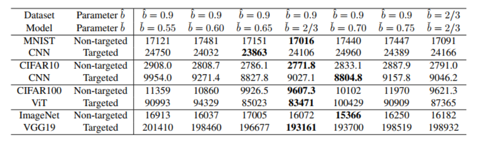 表 4. TtBA 针对鲁棒训练模型在不同参数 (b^,bˇ)(\hat{b},\check{b})(b^,bˇ) 下的 AUC