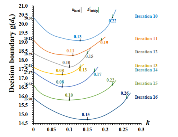 如果 kkk 太大,dkd_{k}dk 会偏离最优对抗性示例(图 1 中的 x~local\tilde{x}{\mathrm{local}}x~local),使得优化无效。为了确定 kkk 的上界,我们引入一个阈值 k=kbridgeik = k{\mathrm{bridge}}^{\mathrm{i}}k=kbridgei,使得沿 dkd_{k}dk 的决策边界等于当前方向 d~i\tilde{d}^{i}d~i 的决策边界。然后 kkk 在 (0,kbridgei](0, k_{\mathrm{bridge}}^{\mathrm{i}}](0,kbridgei] 范围内进行优化。几何上,TtBA 生成的扰动方向范围类似于一个拱桥,跨越在局部最优对抗性示例 x~local\tilde{x}{\mathrm{local}}x~local 之上,从 x~i\tilde{x}^{i}x~i 延伸到 x~bridgei\tilde{x}{\mathrm{bridge}}^{\mathrm{i}}x~bridgei,如图 1 所示。