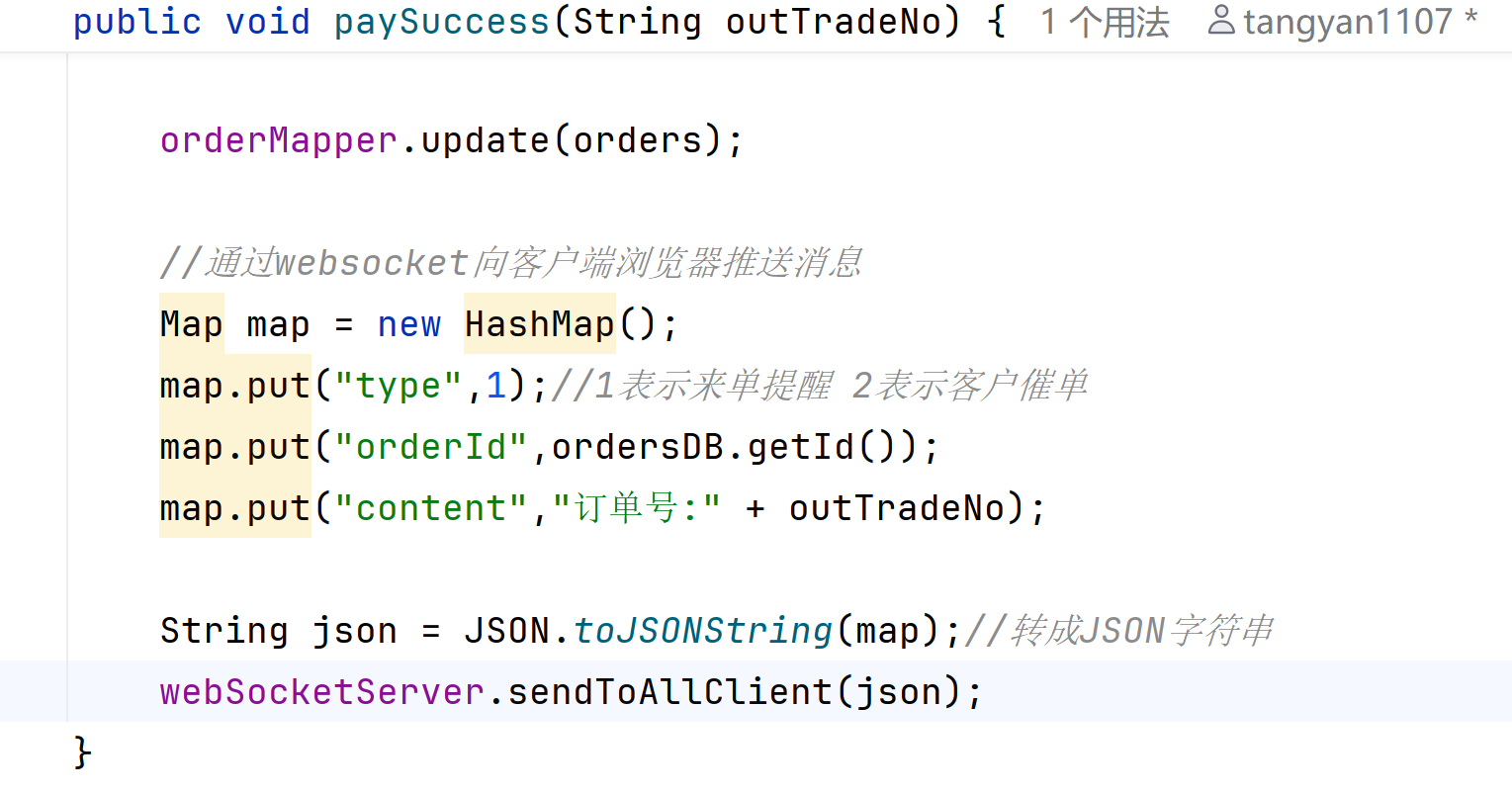 当用户点击催单按钮后,调用WebSocket的相关API实现服务端向客户端推送消息