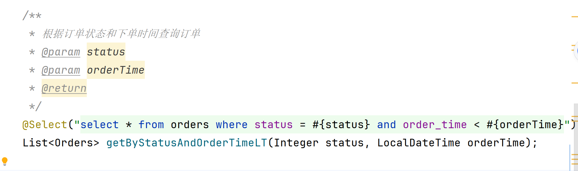 List<Orders> ordersList = orderMapper.getByStatusAndOrderTimeLT(Orders.DELIVERY_IN_PROGRESS, time);