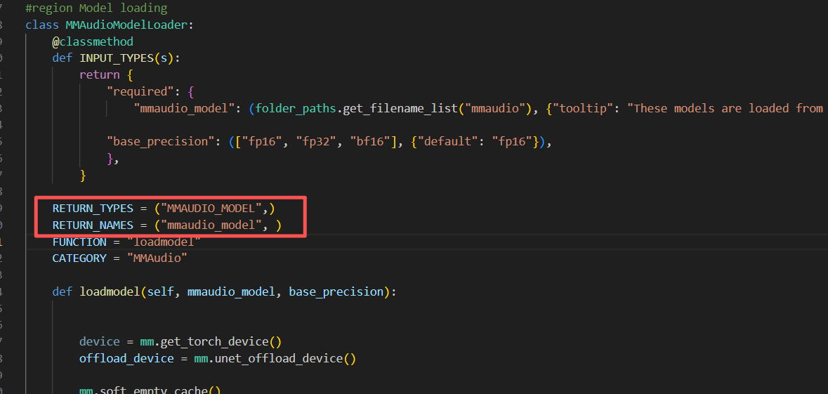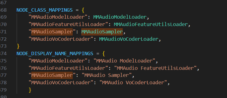 NODE_CLASS_MAPPINGS 就是映射,里面的节点名字随便你设置,例如MMAudioModelLoader是这个节点的名字,他对应的是绿色的MMAudioModelLoader这个类