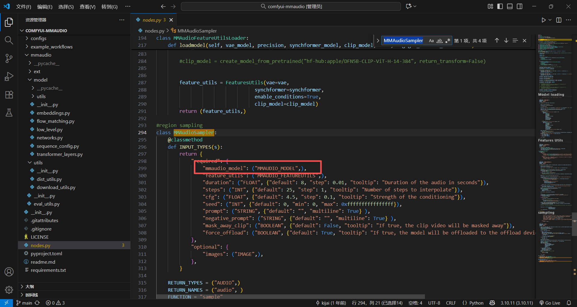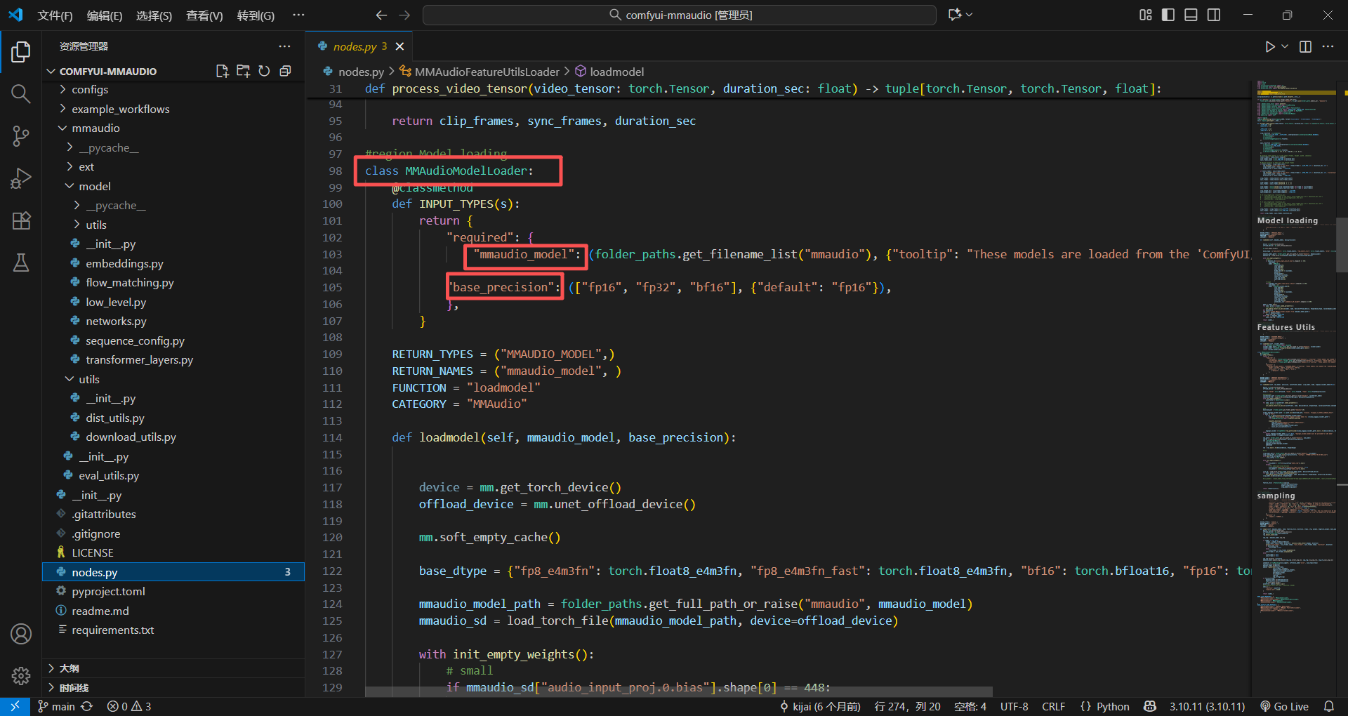 上面的太过复杂,当然是一定得看的,我自己总结了一下,根据节点mmaudio的nodes.py为例子(其他节点的文件名字可能不一样,但是一般放在最外层),大概就是: