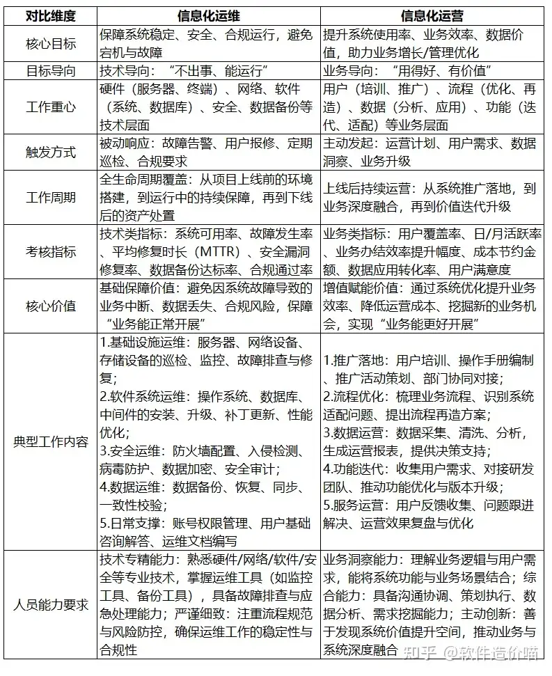 运维与运营的差异贯穿于工作全流程,从目标导向到考核标准,从工作内容到人员能力,均存在显著区别。以下从9个核心维度展开详细对比: