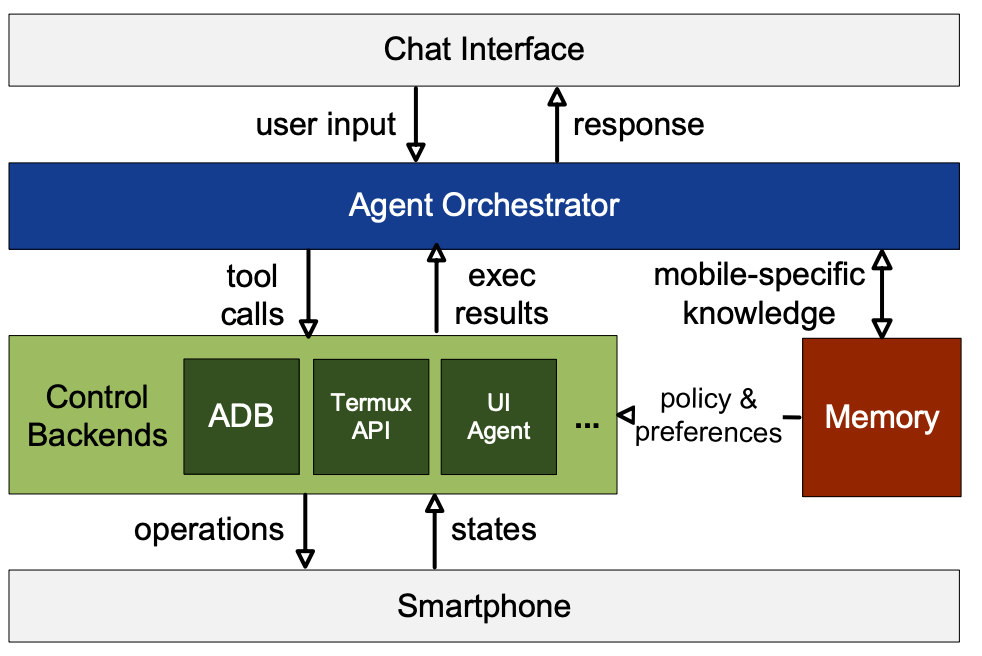 MBZUAI、香港城市大学联合发布,主打智能手机原生(Smartphone-Native)的AI智能体系统。将高层的LLM推理与底层的手机设备控制(API、ADB、UI交互)进行解耦,把一个完整Agent装进口袋里,通过Telegram等聊天界面,直接让手机自己在后台完成跨App的复杂任务(如查资料写备忘录、装App、控制系统设置等)。