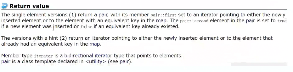 如果key不在map中,插入成功,则返回一个pair<iterator,bool>对象
