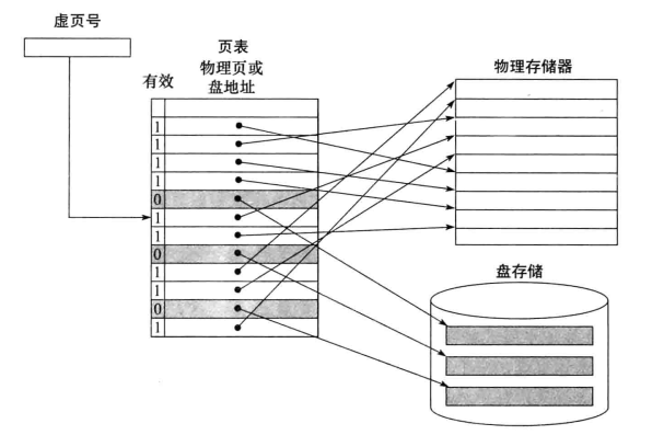 CPU 要访问一个数据的时候会给出一个虚拟地址,将虚拟地址拆分为虚拟页号和页内偏移。根据虚拟页号去查页表,如果这个页已经被调入内存,就将有效标记位记为 1,此时用页表中查到的物理页号加上不变的页内偏移,就得到物理内存地址。如果该页没有调入内存,就将有效标记位记为 0,此时会触发缺页中断,页表项中存放的是该页在外存中的地址。如果内存中的页面已满,就使用页面替换算法换出某一页,这一过程和 Cache 的替换机制很相似。
