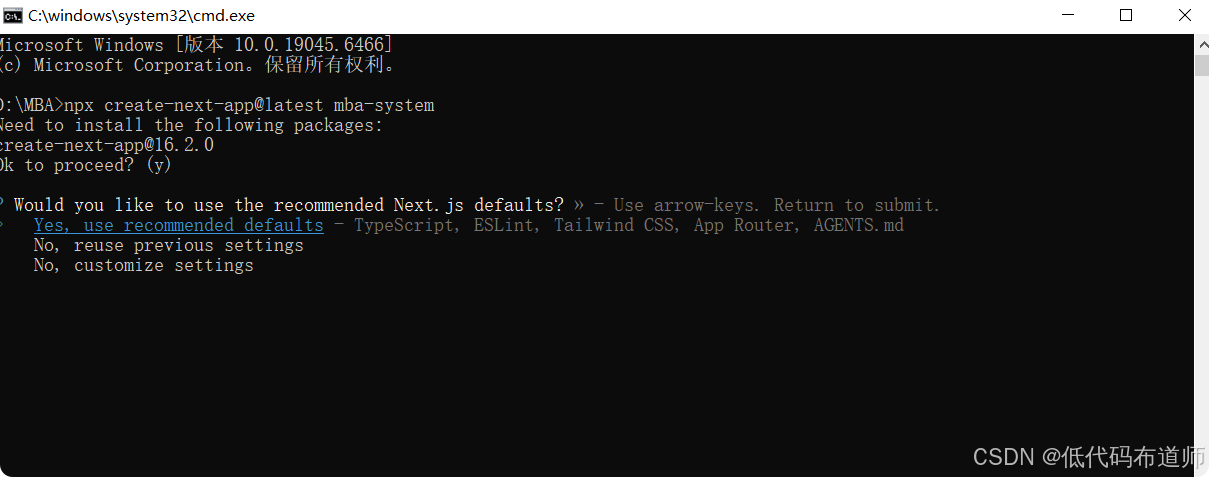 打开cmd,我们使用 Next.js 官方提供的脚手架一键生成项目。