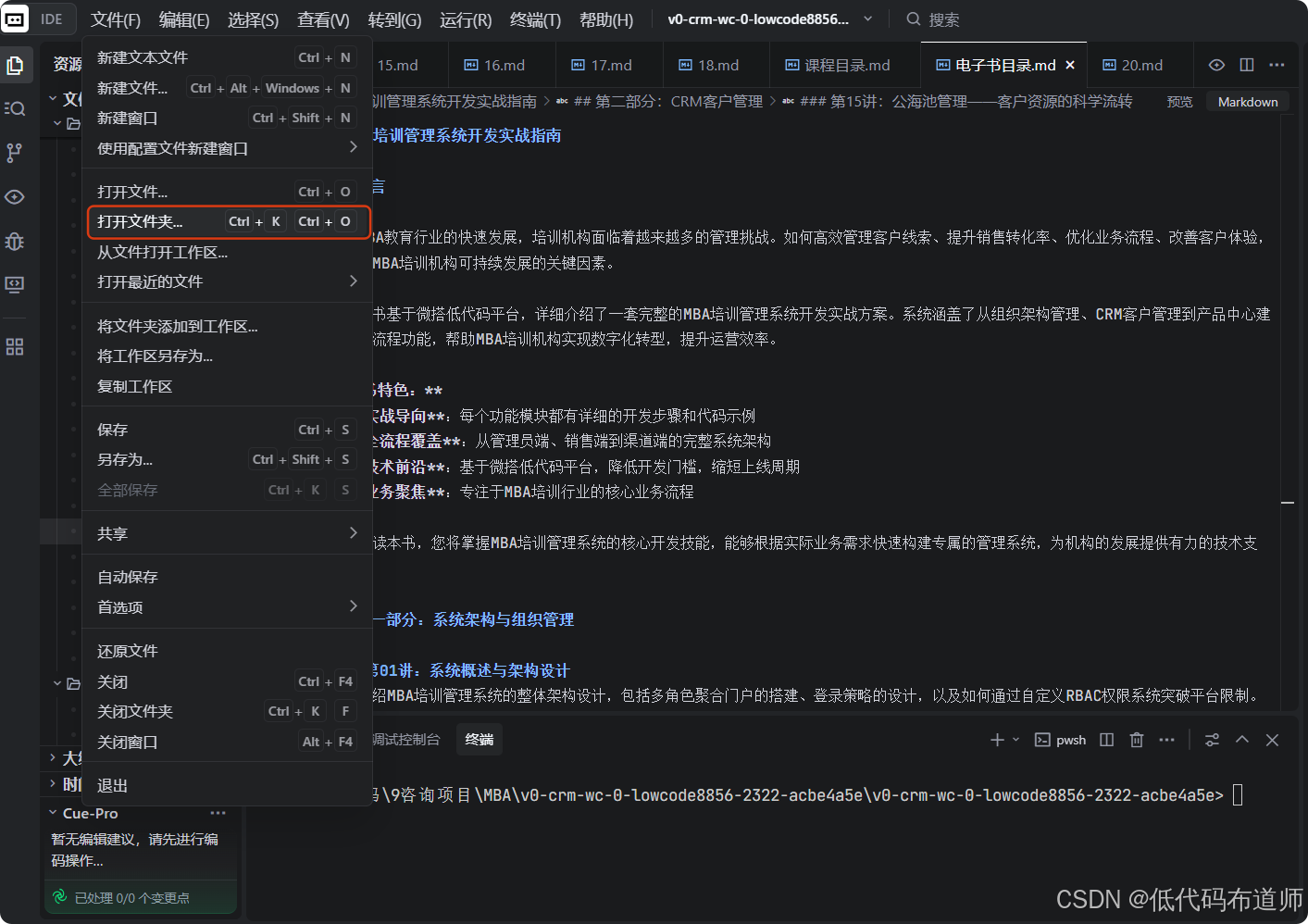 初始化成功后,需要按照项目必要的依赖型。打开我们的trae,点击文件-》打开文件夹,选择我们的工程目录