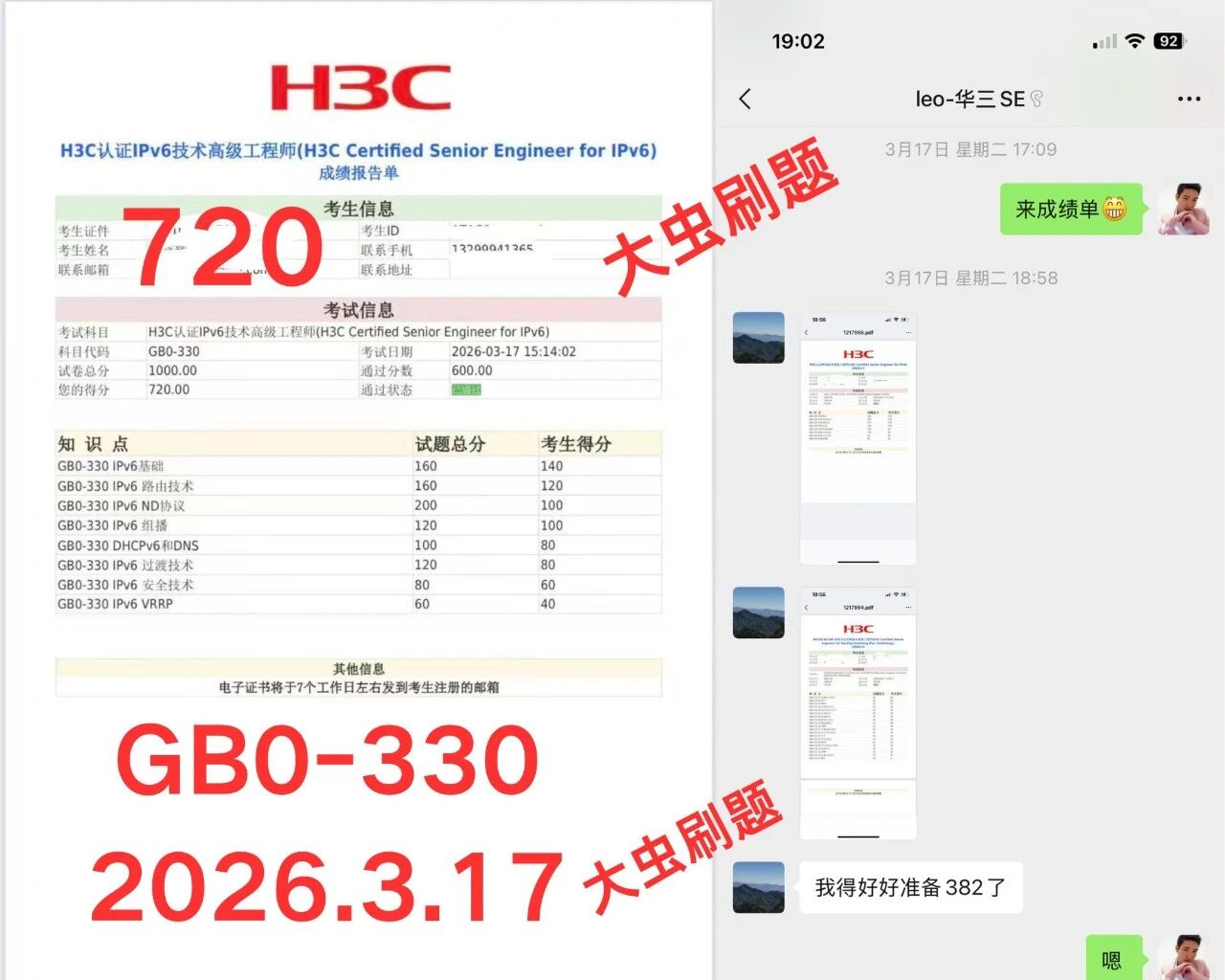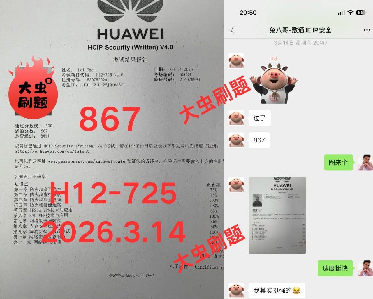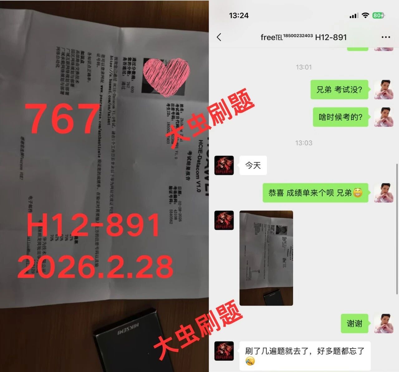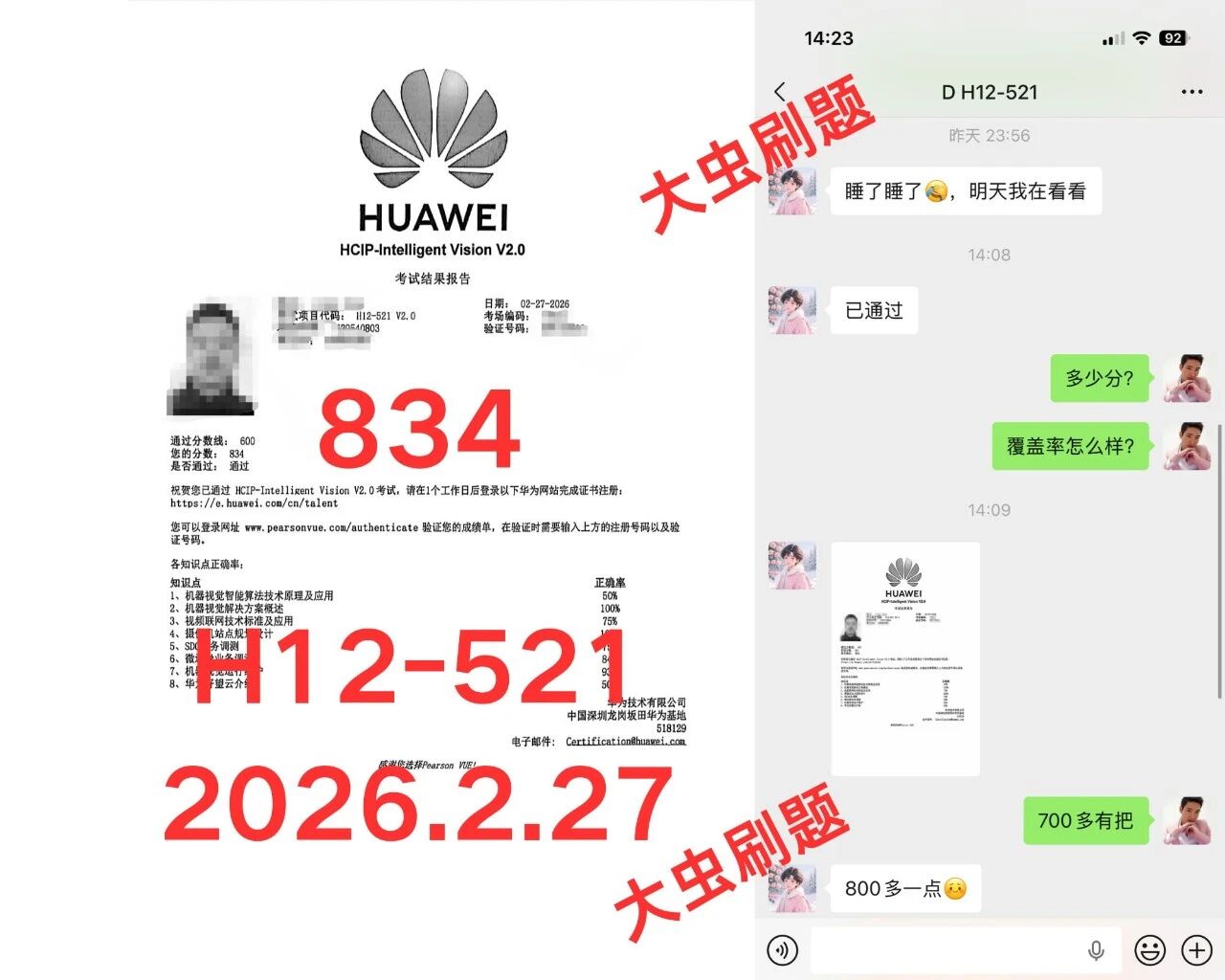 2026年,大虫刷题将继续关注题库动态,提供精准的华为华三考试信息及题库,为广大考证、续证的兄弟规避风险,提高通过率。以下将展示大虫刷题2026年近期通过的部分成绩单。