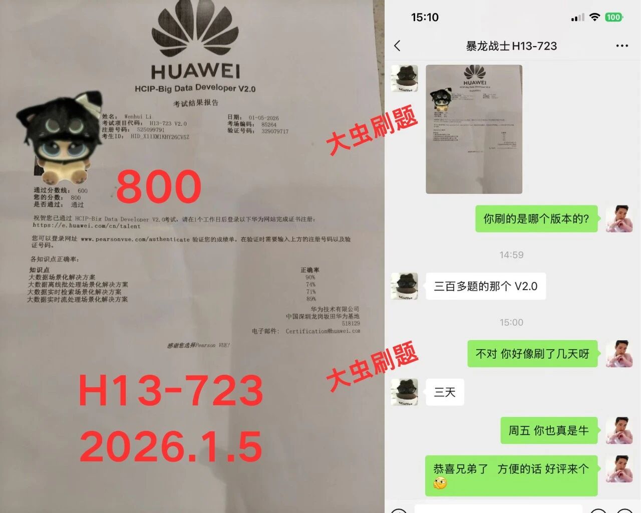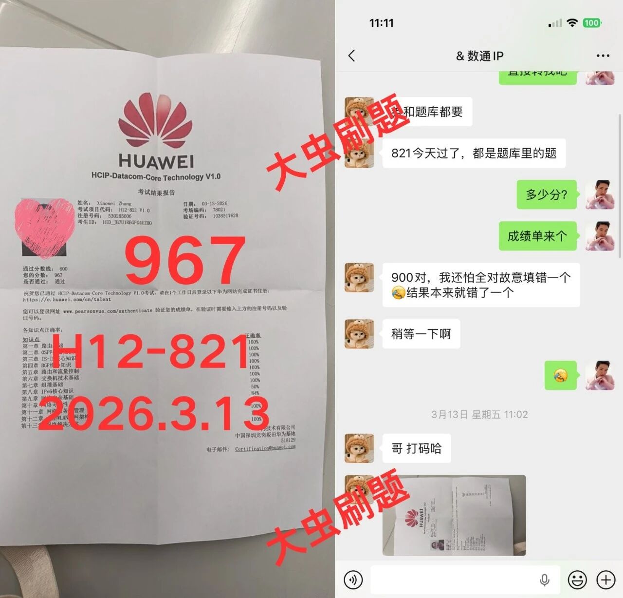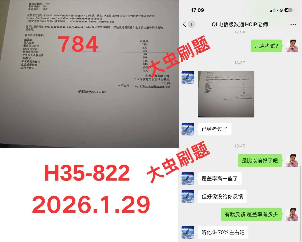 2026年,大虫刷题将继续关注题库动态,提供精准的华为华三考试信息及题库,为广大考证、续证的兄弟规避风险,提高通过率。以下将展示大虫刷题2026年近期通过的部分成绩单。