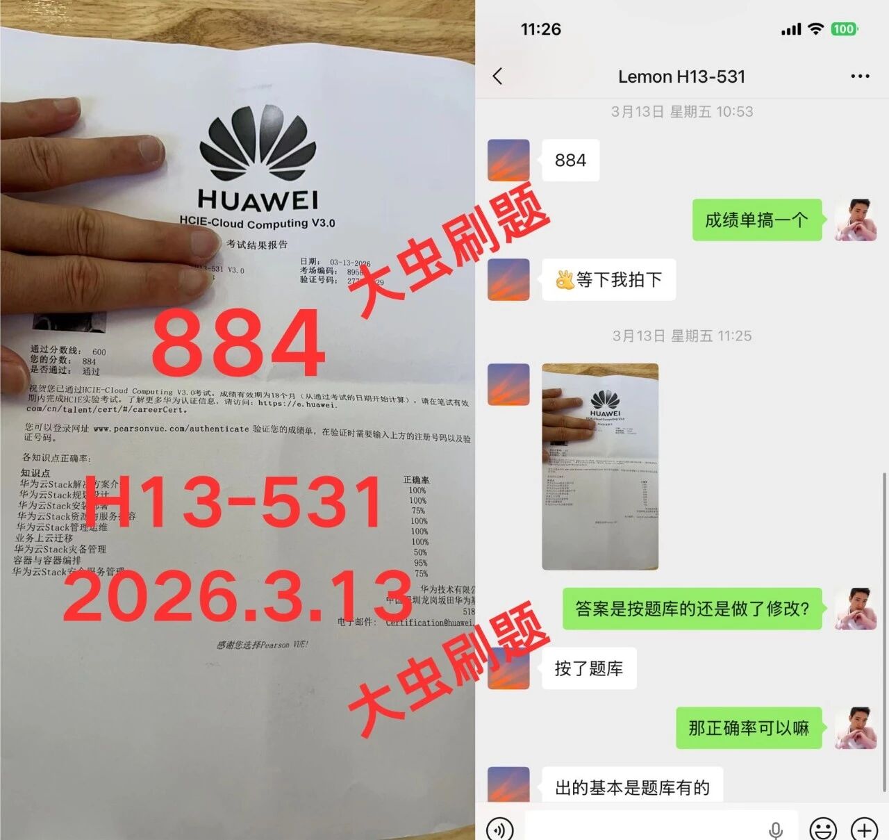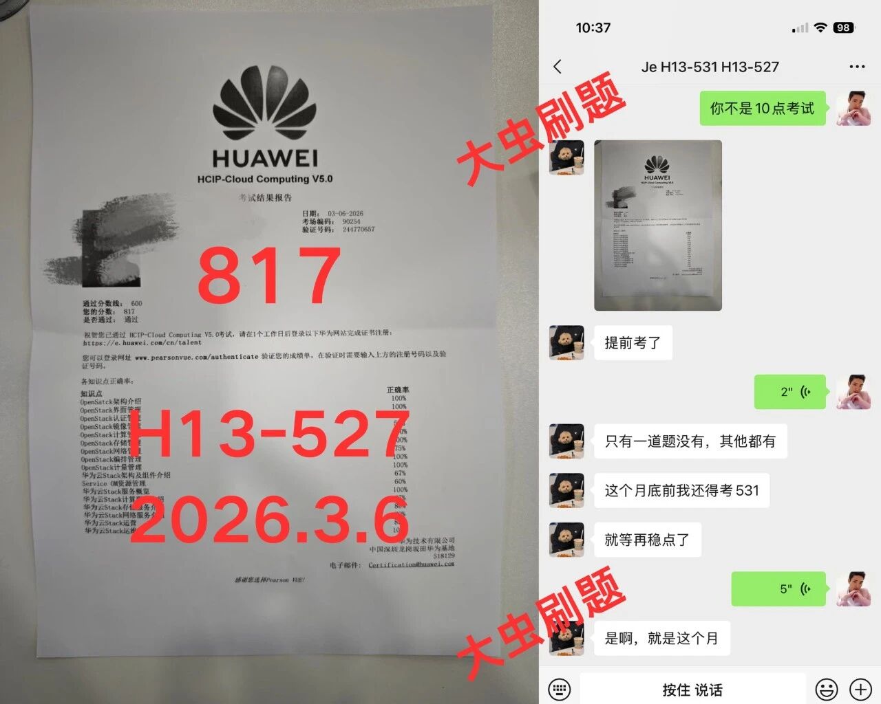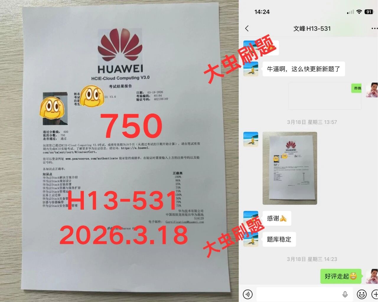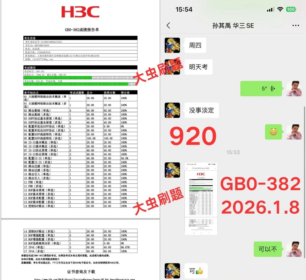 2026年,大虫刷题将继续关注题库动态,提供精准的华为华三考试信息及题库,为广大考证、续证的兄弟规避风险,提高通过率。以下将展示大虫刷题2026年近期通过的部分成绩单。