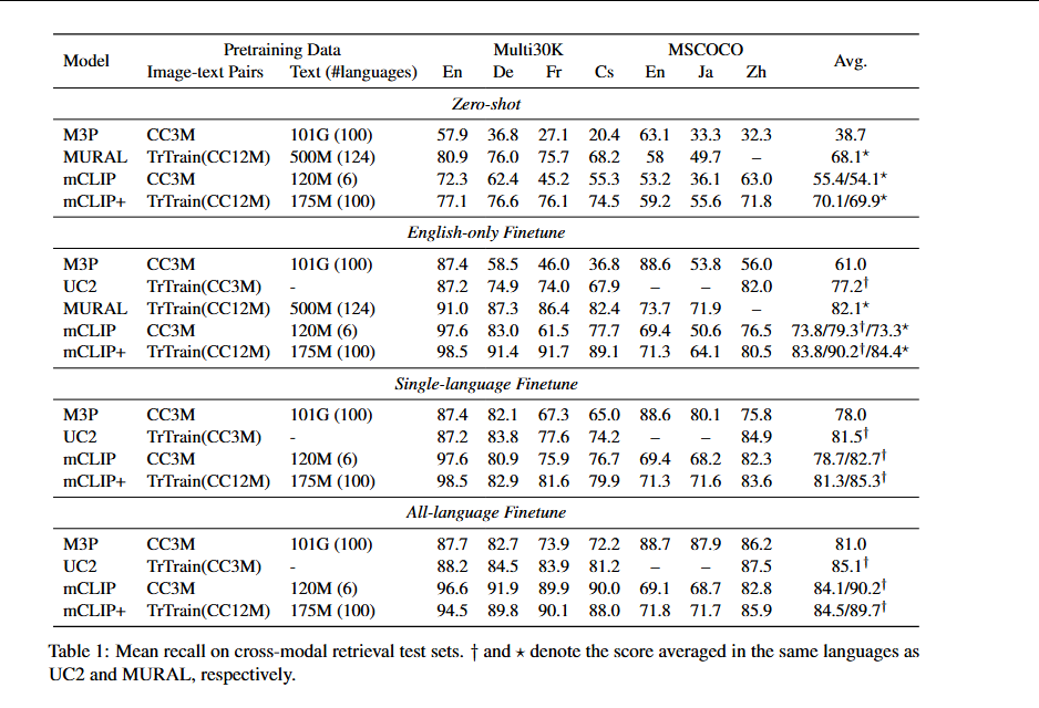 Multi30K和MSCOCO上零样本和微调的跨模态检索结果。全语言微调对于mCLIP和mCLIP+都具有最高的平均召回分数。(推测这是因为具有多种语言的图像-文本对允许投影器显式学习多语言多模态对齐,而不是依赖嵌入在MTE中的隐式多语言性。)