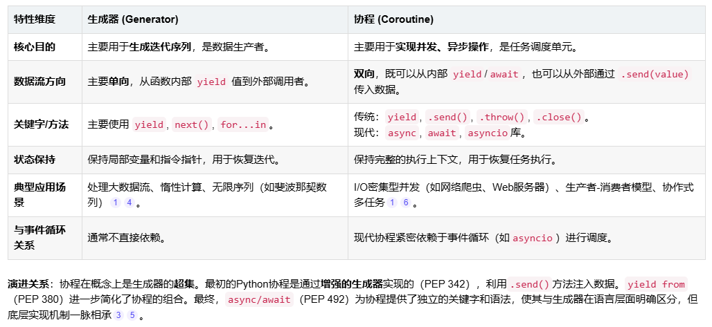 - 协程是生成器概念的延伸,其核心是能够暂停执行并接收外部传入的值。早期的Python协程(称为"基于生成器的协程")正是通过增强生成器的功能来实现的,即生成器不仅可以yield一个值出去,还可以通过.send(value)方法接收一个值,这个值会成为yield表达式的返回值。
