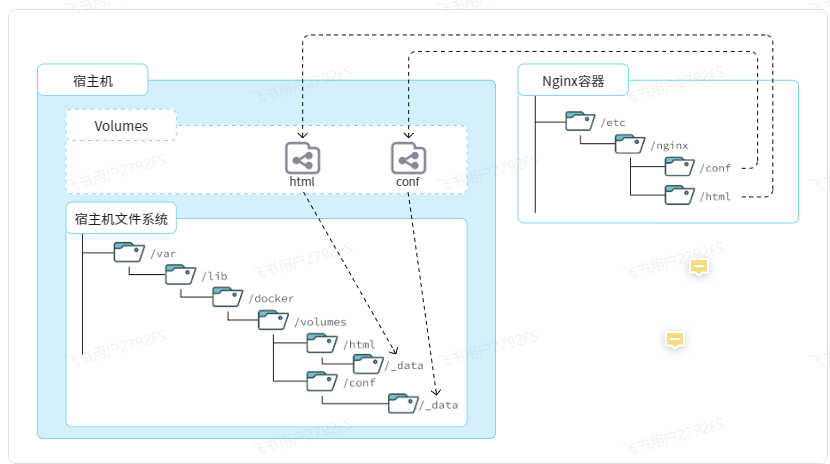 数据卷类似Vue的挂在,容器和宿主机的文件是同步增删的。