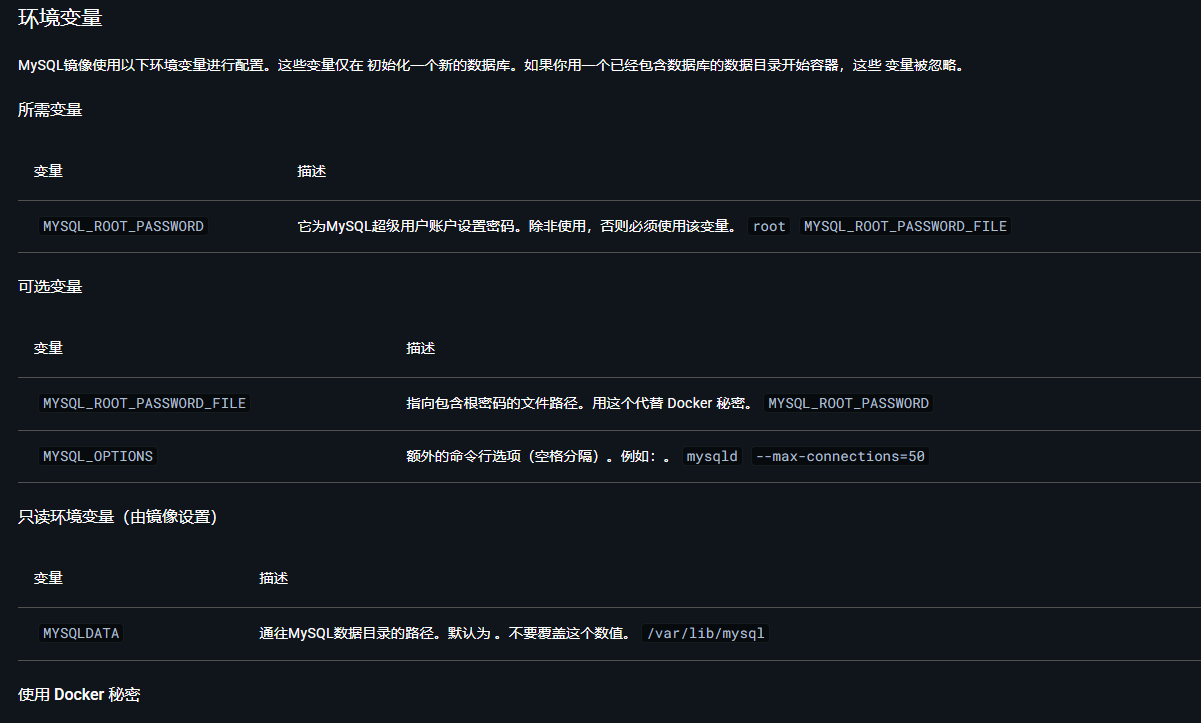 其中-e的环境变量去docker hub官网中查对应镜像的介绍中,environment的一项中有写