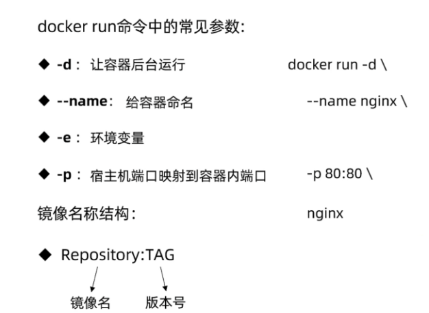 | docker run | 创建并运行容器(不能重复创建) | docker run |