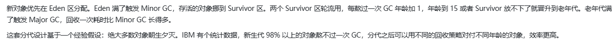 - 特点:高频 Minor GC(Stop-The-World 时间短),回收"朝生夕死"对象。