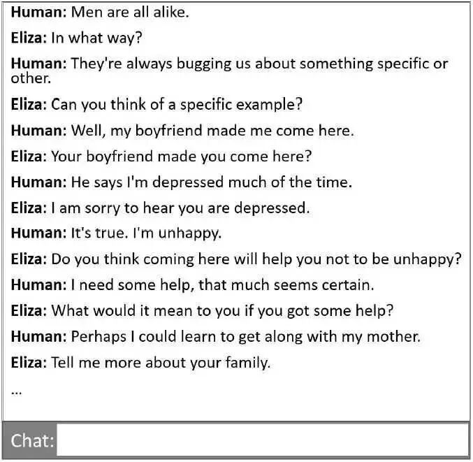 1966年,麻省理工学院的约瑟夫·维森鲍姆(Joseph Weizenbaum)开发了一个叫ELIZA的程序。它能模仿心理医生跟人"聊天",通过模式匹配的方式,把用户说的话重新组织成问题抛回去。