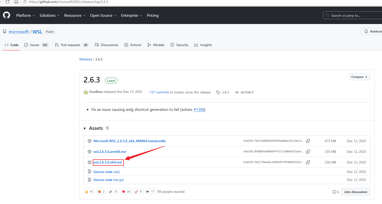 (1)访问 WSL 官方 GitHub 发布页: https://github.com/microsoft/WSL/releases/latest