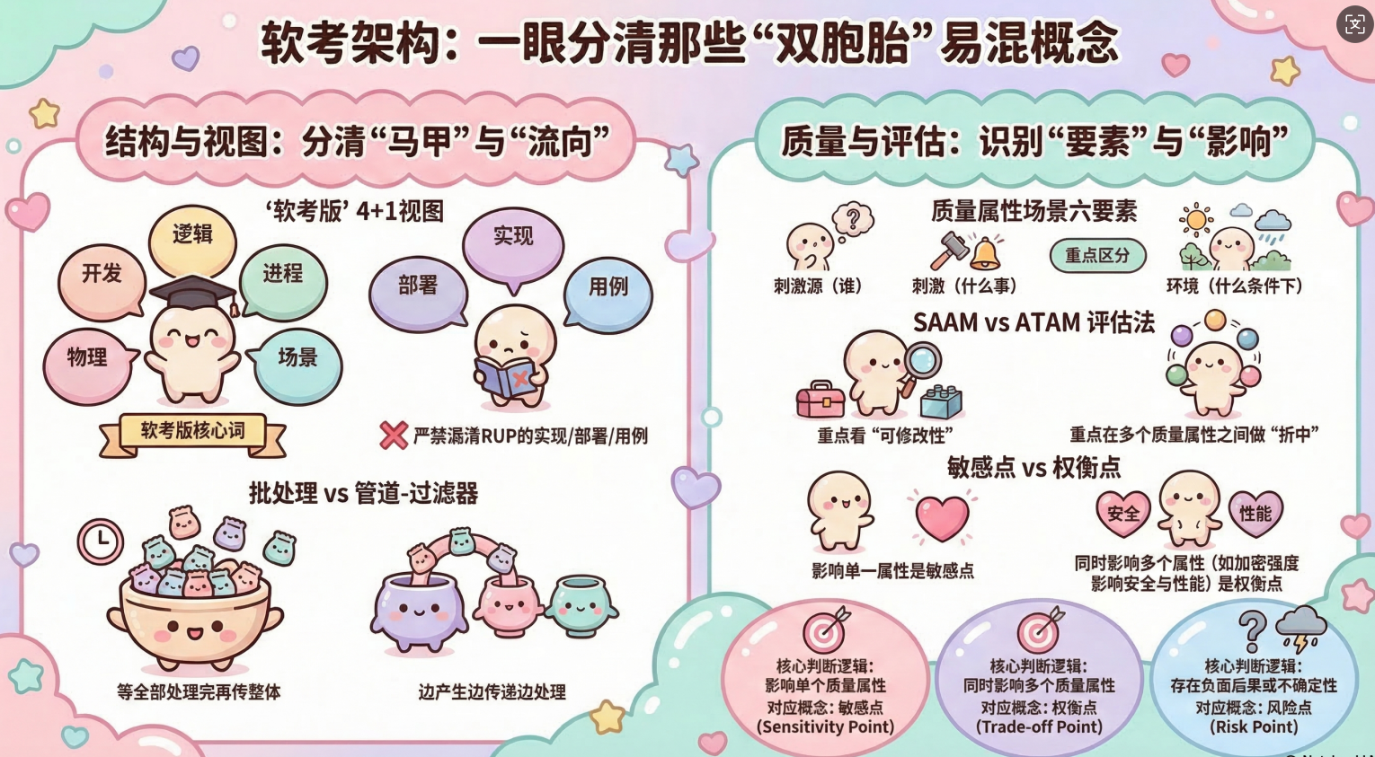 更稳的顺序是:先把 4+1 视图的两套说法 分清,再把 架构风格尤其是批处理和管道-过滤器 分清,然后把 质量属性场景六要素 分清,最后把 SAAM/ATAM 和敏感点/权衡点/风险点 分清。这样复习,抓的都是最容易丢分的边界。