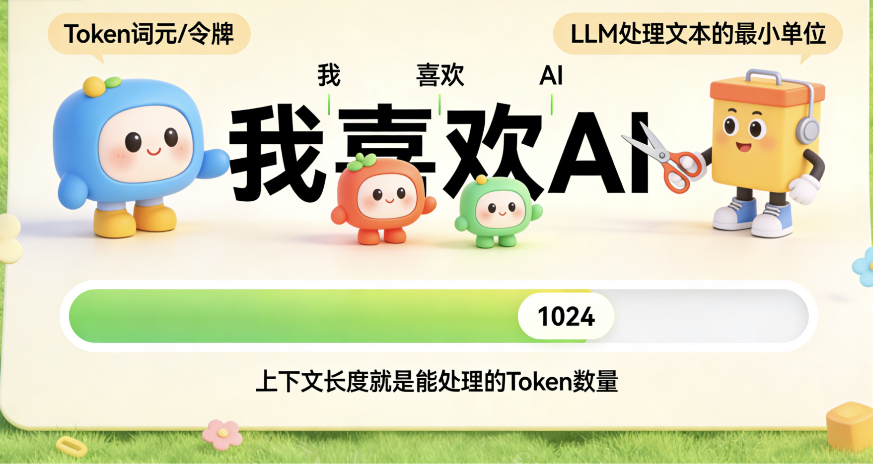 Token(Token): 词元/令牌 :LLM处理文本的"最小单位",相当于我们说话的"字或词"。比如句子"我喜欢AI",在LLM里可能会被拆分成【我、喜欢、AI】三个Token,也可能拆分成更细的单位(比如"喜、欢"),拆分的工具就是下面的Tokenizer。LLM的"上下文长度",本质就是"能处理的Token数量"------比如上下文长度1024,就意味着模型能记住1024个Token的内容(大概几百字)。