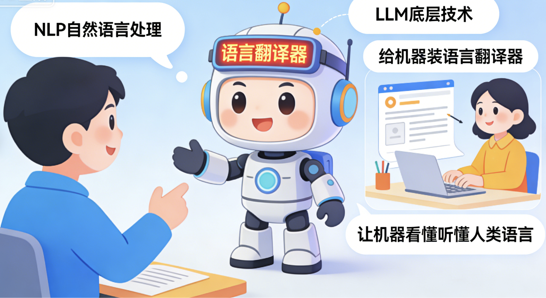 NLP(Natural Language Processing): 自然语言处理 :LLM的"底层技术",指"让机器理解和生成人类语言"的技术。比如机器能听懂你的提问、能生成通顺的句子、能翻译文本,都靠NLP。简单说,NLP就是"给机器装一个'语言翻译器'",让机器能看懂人类的话,也能说出人类能懂的话。