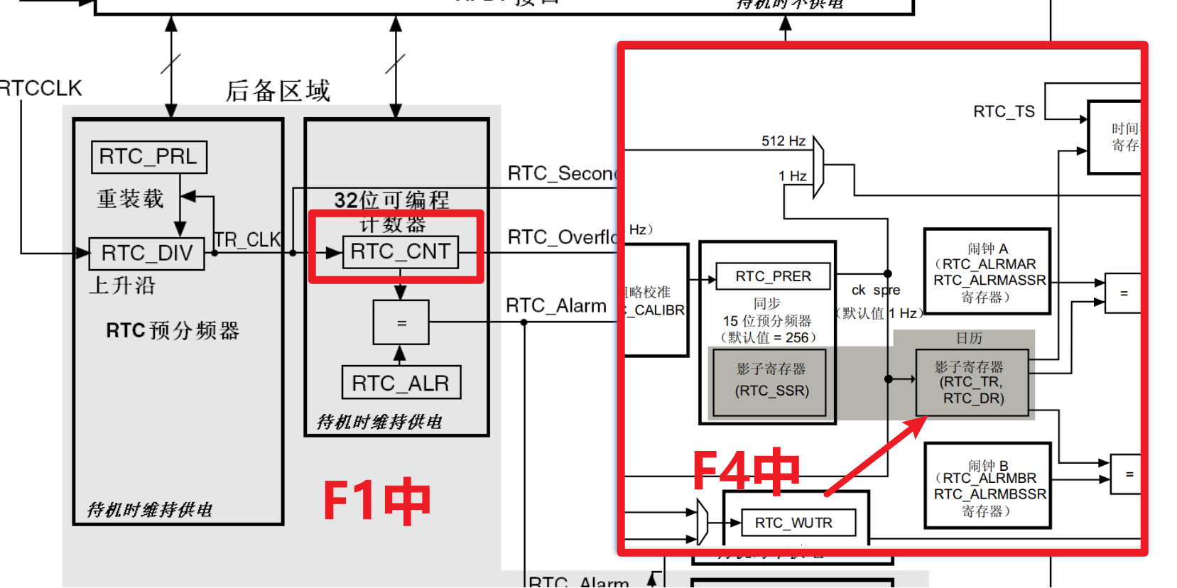由于RT中使用的HAL库函数,而F1系列芯片RTC中并没有DR(存储日期)和TR(存储时间)寄存器,只有CNT寄存器,因此在使用硬件RTC时,不能在使用下面四个函数对RTC操作。F4并不影响F4硬件RTC(可直接复制)
