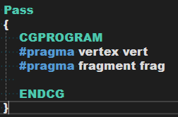 CG程序片段通过指令嵌入在Pass中,夹在指令CGPROGRAM和ENDCG之间,通常看起来是这样的: