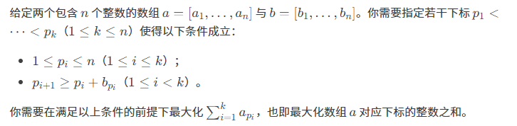 这是一个典型的带跳跃限制的动态规划问题。如果我们当前选择位置 i,那么下一个可选择的位置必须满足 j≥i+b[i]。因此,可以从 i 跳到区间 [i+b[i], n]。