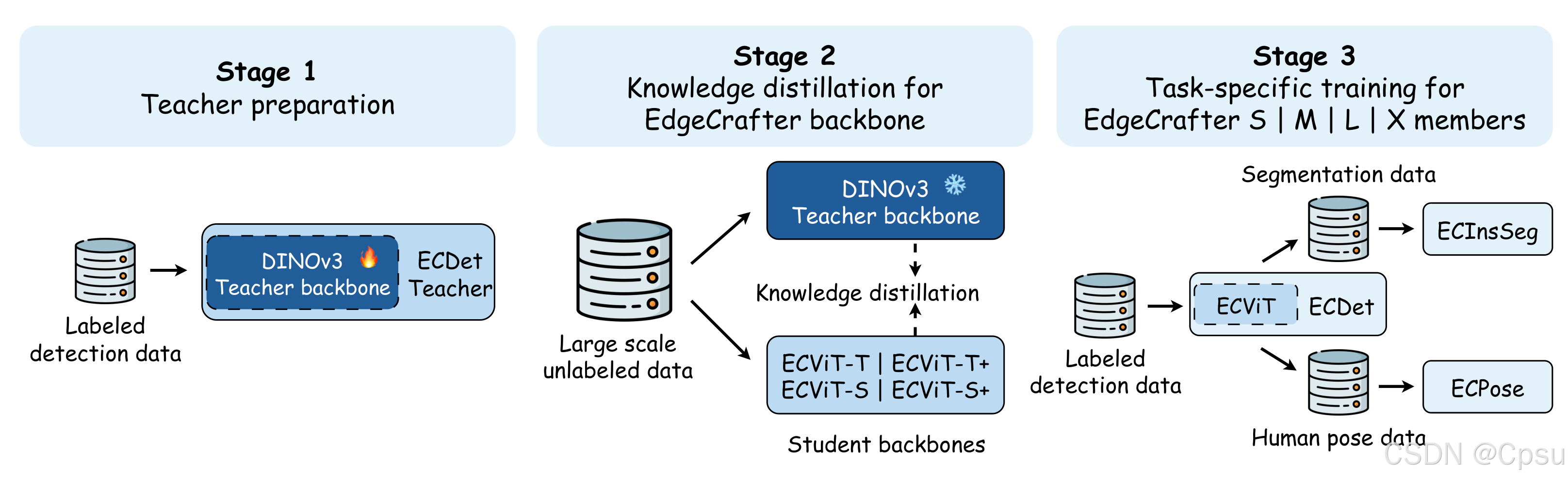 - 通过特征对齐,将教师网络的检测导向表征迁移到紧凑型学生网络(ECViT)