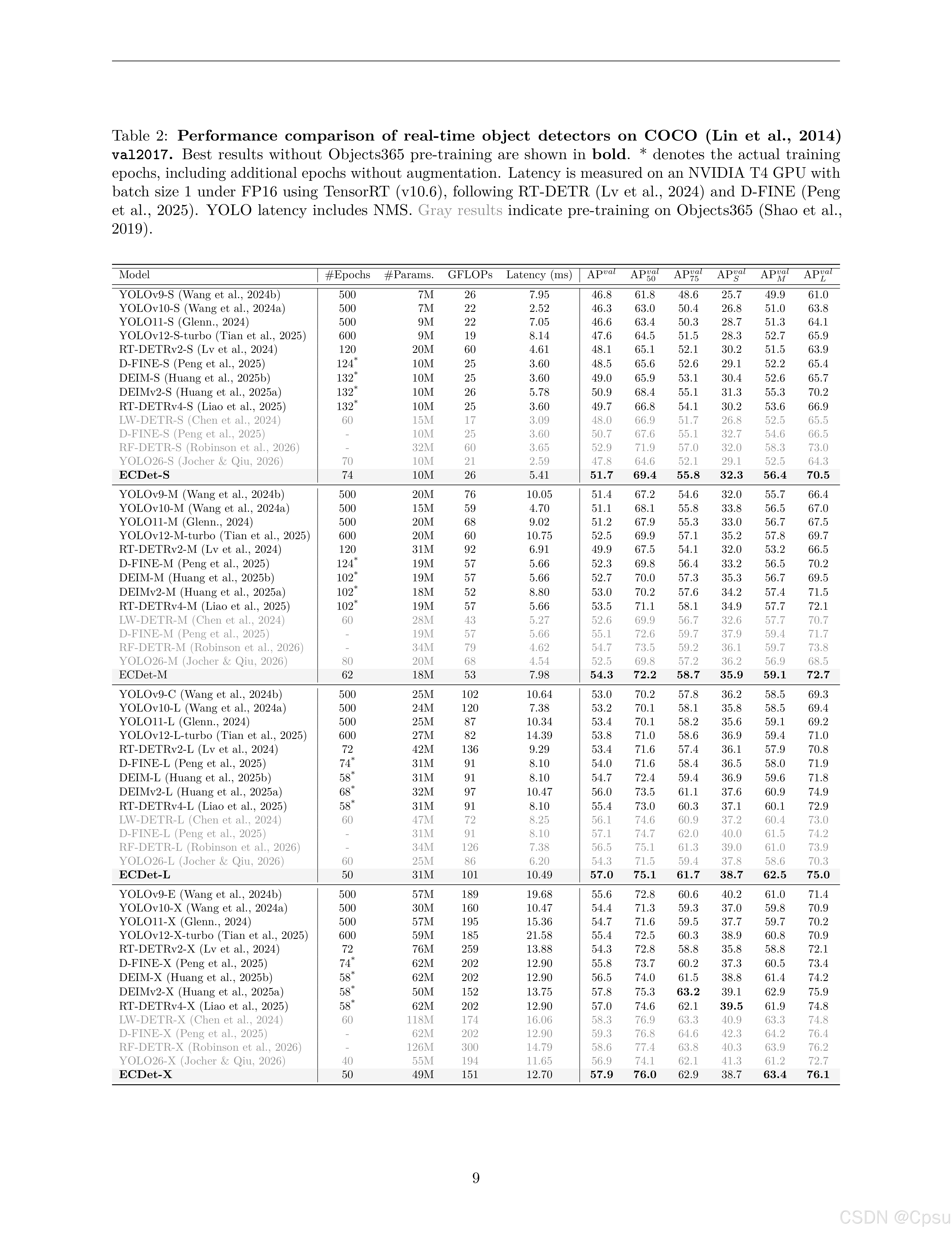 - ECDet-S(10M参数)达到51.7 AP,在不依赖Objects365预训练的情况下,与现有实时检测器相比具有竞争力
