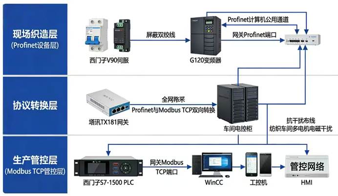 产线总控采用西门子S7-1500系列PLC(Modbus TCP协议),搭配WinCC SCADA系统、工控机与HMI,负责工艺参数设置、设备运行监控、产量统计。由于Profinet伺服、变频器与Modbus TCP S7-1500 PLC协议不兼容,伺服定位数据、变频器运行参数无法上传,PLC无法远程调控设备工艺参数,产线只能本地手动操作,面料织造精度低、次品率高,无法满足高端面料生产要求,同时生产数据无法采集,无法实现工业物联网数字化管理,亟需通过工业网关完成协议转换,提升产线自动化与数字化水平。