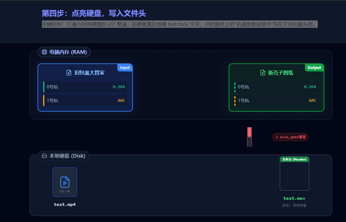 在内存中新建一个针对 MOV 格式的"输出空壳"。注意:此时这只是个内存图纸,硬盘上依然什么都没有发生。