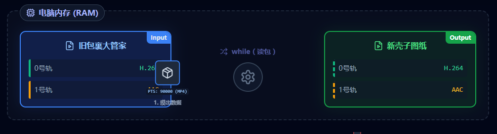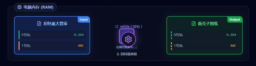 买一个"结实的空信封(Packet)"。不断从旧管家摸出数据,经过"时间比例尺"的精准换算,变成 MOV 的时间,再交织写入新文件,最后倒空信封复用。