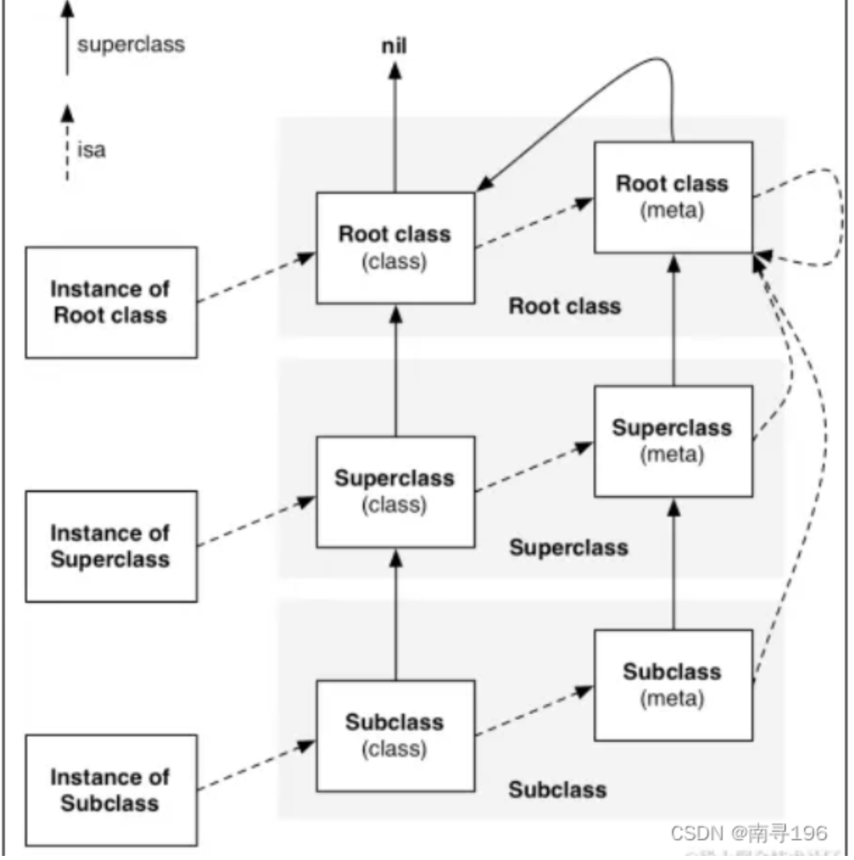 [NSObject class]获取的是NSObject的类对象,用于创建实例([[NSObject alloc] init])。 - 元类 (Meta Class) :是类对象的 "类",专门存储类方法(