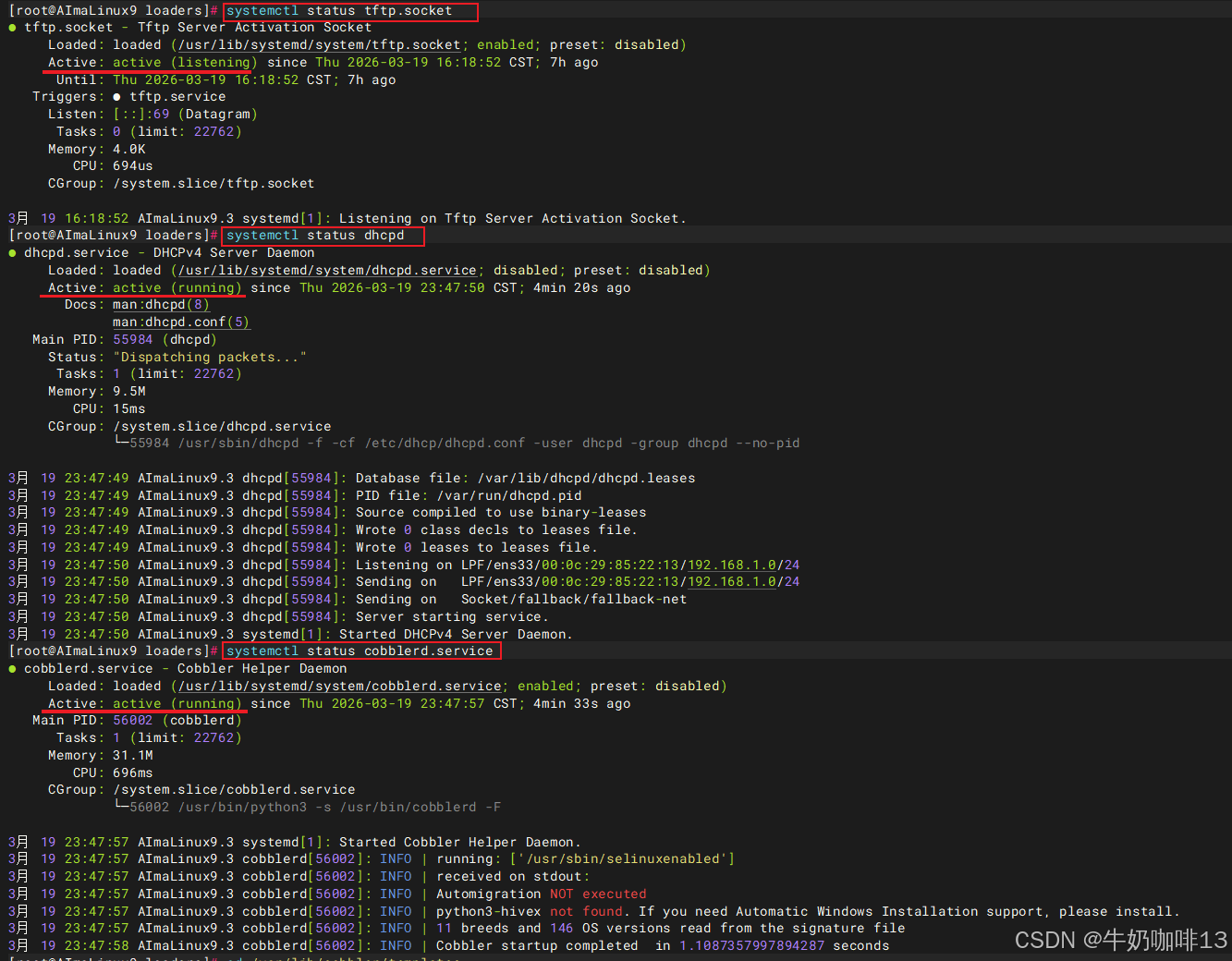 #查看cobblerd、tftp.sock、dhcpd服务是否都正常运行中