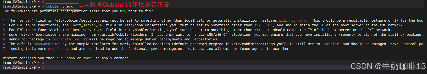 #1-检查Cobbler的环境是否正常命令(初次安装好后检查会有很多的内容需要修复,我们逐一修复)