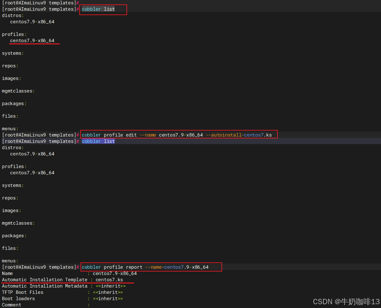 | Cobbler的数据目录 | /var/lib/cobbler/templates | 默认存放kickstart文件(即:各系统自动安装的引导文件) |