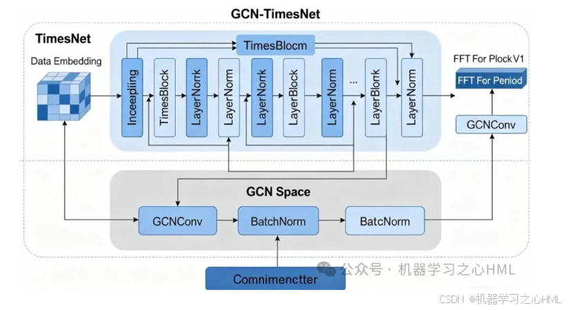 - 注意力机制融合:在 TimesNet 与 GCN 之间引入交叉注意力,实现时序特征与空间特征的深度融合。