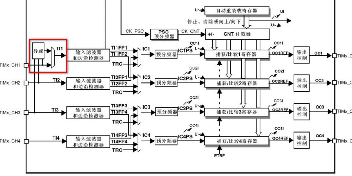 | 1 | TI1选择 CR2->TI1S | 控制TI1在的选择 0:TIMx_CH1引脚连接到TI1输入 1:TIMx_CH1、TIMx_CH2、TIMx_CH3引脚经过异或后连接到TI1输入 | 0 |