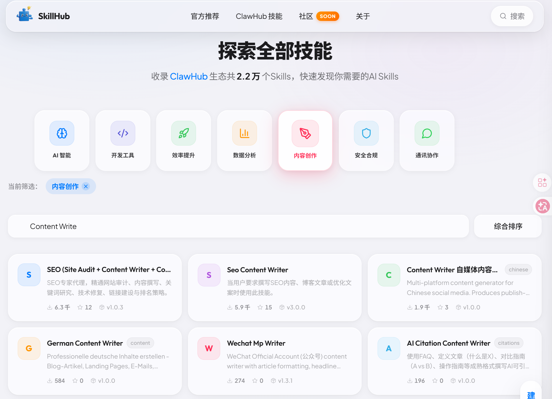 请先检查是否已安装 SkillHub 商店,若未安装,请根据 https://skillhub-1388575217.cos.ap-guangzhou.myqcloud.com/install/skillhub.md 安装Skillhub商店,然后安装content-writer技能。