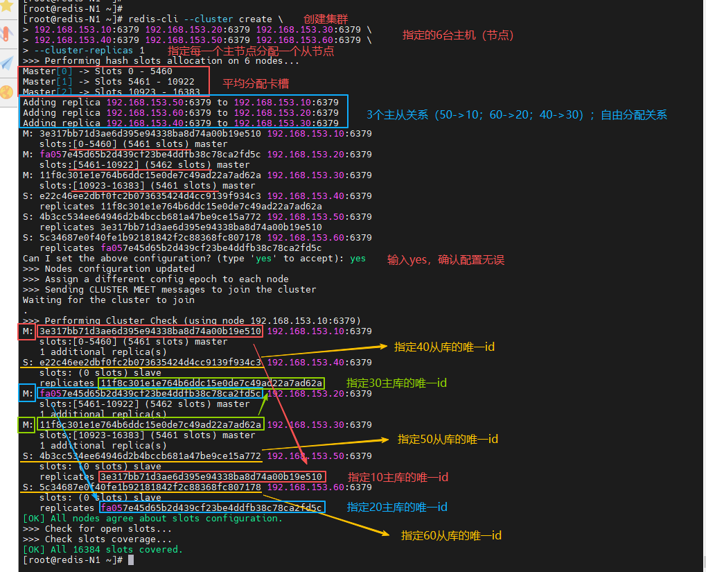 [root@redis-N1 ~]# redis-cli --cluster create 192.168.153.10:6379 192.168.153.20:6379 192.168.153.30:6379 192.168.153.40:6379 192.168.153.50:6379 192.168.153.60:6379 --cluster-replicas 1